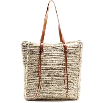 miss fong Beach Bag, Beach Bags for Women,Straw Bag, Beach Tote Bag, Straw Beach Bag with Inner Zipper Pocket and Leather Handle