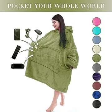 Show moreIntroducing the Miss Mila Wearable Blanket Hoodie, your new go-to companion for comfort and warmth! This extra-long oversized hoodie blanket is not only one of Amazon's most popular items, but it also redefines relaxation for both adults and teenagers. Crafted to snuggle you in a warm, cozy embrace, it's perfect for a range of activities such as lounging at home, sleeping, reading your favorite book, or even engaging in outdoor fun with family and friends. Whether you’re working on your laptop, watching TV, or enjoying some quality time outdoors, this hoodie blanket's unique design allows you to stay comfortable and warm in any situation.