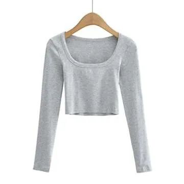 MISSACTIVER Women Basic Scoop Neck Long Sleeve Crop Tee Top Casual Ribbed Knit Skinny Solid Cropped T-Shirt Pullover Tops Grey