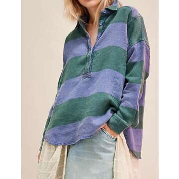 MISSACTIVER Women Color Block Striped Oversized Sweatshirt Button Henley Neck Pullover High Low Curved Hem Tunic Tops Blue Green