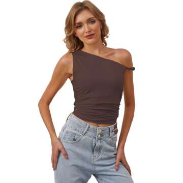 MISSACTIVER Women’s Off Shoulder Ruched Crop Tank Tops One Shoulder Twist Strap Crop Tops Summer Going Out Top Crop Shirts Brown
