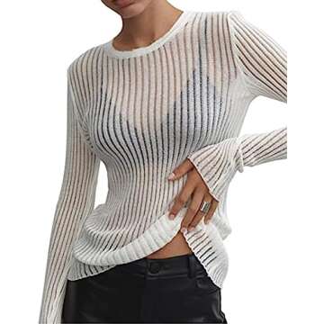 MISSACTIVER Women’s Solid See Through Mesh Knitted Sweater Crew Neck Long Sleeve Sheer Basic Loose Fit Pullover Shirt Tops(Medium,White)