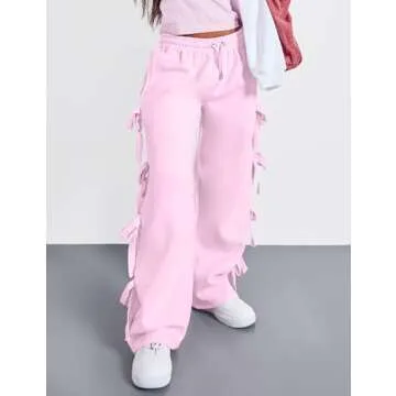 MISSACTIVER Women Side Bow Tie Wide Leg Sweatpants High Waisted Baggy Flared Joggers Drawstring Waistband Pants with Pocket Pink