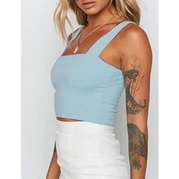 Show moreIntroducing the MISSACTIVER Women Summer Basic Crop Top, the ultimate addition to your warm-weather wardrobe! Crafted from a hybrid blend of Polyester and Acrylic, this solid crop tank top offers unparalleled comfort and breathability, making it the perfect choice for both casual outings and active pursuits. The light blue hue exudes a chic, summery vibe, allowing you to stay stylish while feeling at ease all day long. With its square neck design and wide shoulder straps, it elegantly contours your figure, giving you that sought-after trendy look without compromising on comfort.