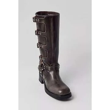 MissHeel Square Toe Wide Calf Knee High Cowboy Boots for Women Distressed Black Motorcycle Boots Low Heel Riding Boots Harness Size US 10