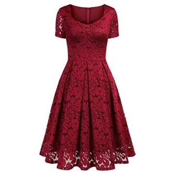 Show moreIntroducing the MISSMAY Women's 50s Floral Lace Short Sleeve V Neck Cocktail Wedding A-Line Dress in a vibrant red hue, a stunning addition to your wardrobe for all special occasions. This dress perfectly blends retro elegance with contemporary style, showcasing a charming floral pattern that adds a touch of feminine grace. Designed thoughtfully with a zipper closure at the back, it facilitates easy wear while providing a flattering fit. Crafted with a full lace overlay, this dress radiates sophistication, making it an ideal choice for evening events, cocktail parties, weddings, and formal gatherings. Available in sizes ranging from Small (US 4/6) to XX-Large (US 20), this dress ensures a beautiful fit for various body types.