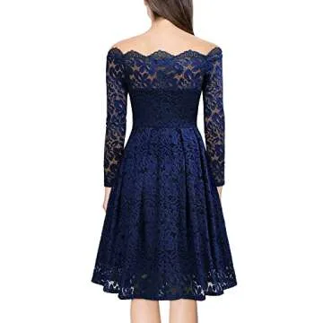 MISSMAY Women's Vintage Floral Lace Long Sleeve Boat Neck Cocktail Party Swing Dress (Large, B-Navy Blue)