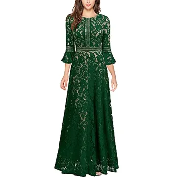 MISSMAY Women's Vintage Full Lace Contrast Bell Sleeve Formal Long Dress (Medium, C-Green)