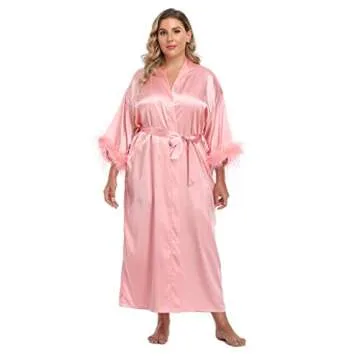 MissNina Women's Long Satin Kimono Robe with Ostrich Feather Trim Silk Robes Full Length Sleepwear Wedding Bridesmaid Robe, Long