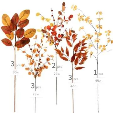 Show moreTransform your space into a vibrant oasis of autumn with the MISSPIN 12 PCS 30 inch Artificial Fall Magnolia Leaves Stems. Each carefully crafted branch extends about 30 inches tall and consists of a harmonious blend of 12 pieces that encapsulate the essence of fall. This delightful assortment includes a stunning Monstera leaf branch, two pumpkin maple leaf berry branches, three moneywort pumpkin branches, three magnolia leaf branches, and three eucalyptus leaf branches. Perfect for adding an inviting touch of seasonal charm to any environment, these artificial branches will bring the rich colors and warm aesthetics of autumn right to your doorstep.