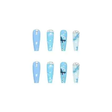 MISUD 24 pcs Coffin Press on Nails Long Fake Nails Blue Glossy Glue on Nails Glitter Ballerina Acrylic Nails Butterfly Pattern False Nails with 3D Rhinestone Designs