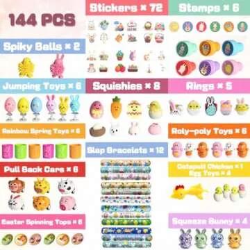 Show more Step into a vibrant world of fun and excitement with our extensive Easter Toy Set, featuring a dazzling array of 144 unique pieces that promise to bring delight and engagement to every child's Easter experience. This extraordinary collection includes everything from stickers, stamps, and jumping toys, to rainbow spring toys, squishies, spiky balls, and even pull-back cars. Each toy is designed with creativity and joy in mind, ensuring a perfect fit for children’s various interests. An innovative selection of catapult chicken and egg toys adds a unique twist that sets this set apart from standard offerings, sparking lively interactions and excitement during playtime.