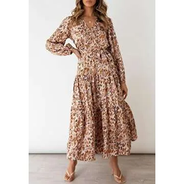 Show moreIntroducing the MITILLY Women's Boho Leopard Print Ruffle Long Sleeve V Neck Casual Flowy Party Maxi Dress – the ideal combination of sophistication and effortless style! This stunning maxi dress is designed to make you feel both beautiful and comfortable, featuring a flowing silhouette that gracefully drapes over your figure. With its long balloon sleeves and a figure-flattering elastic waist, this dress embodies the perfect balance of elegance and ease. The captivating leopard print adds a trendy twist, while the tiered bottom and ruffled hem enhance its bohemian vibe, making it a versatile choice for various occasions.