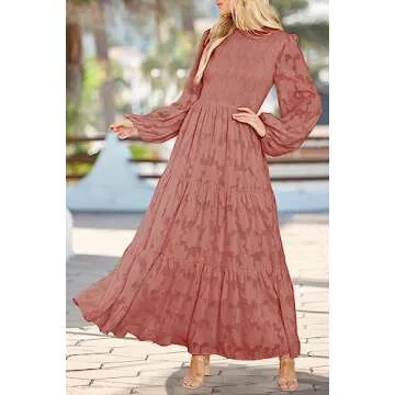Show more Introducing the MITILLY Women's Elegant Floral Long Sleeve Round Neck Smocked A-Line Flowy Tiered Maxi Dress with Pockets in a charming Medium Bean Paste Red. This stunning outfit is crafted from soft, lightweight fabric that embraces comfort while allowing you to express your style effortlessly. With its graceful design featuring a crew neck, floral textured fabric, and a beautiful tiered silhouette, it's no wonder this dress quickly becomes a favorite in your wardrobe. Not only does it showcase the ultimate feminine beauty, but it also ensures that you feel as exquisite as you look on any occasion.