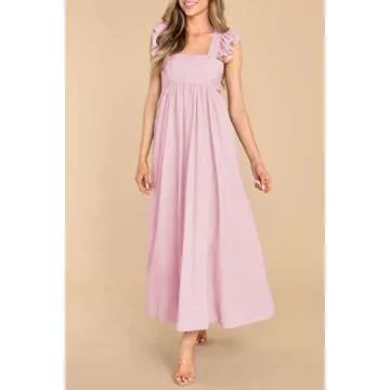 Show moreIntroducing the MITILLY Women's Summer Flutter Sleeve Square Neck Tie Back Casual Pleated A-Line Flowy Maxi Dress in a stunning Small Pink hue. This exquisite maxi dress is designed to elevate your summer wardrobe with its delightful blend of style and comfort. Crafted from a skin-friendly fabric, it boasts a soft-touch experience against the skin, making it perfect for those warm, sunny days. Featuring a square neckline and flutter sleeves adorned with playful ruffle details, this dress adds a touch of elegance while maintaining its casual appeal. The adjustable self-tie on the back and crisscross strap design ensure a customized fit, allowing the dress to conform beautifully to your body shape. Whether you’re attending a special event or enjoying a day out, this versatile dress promises to keep you looking chic and feeling comfortable all day long.