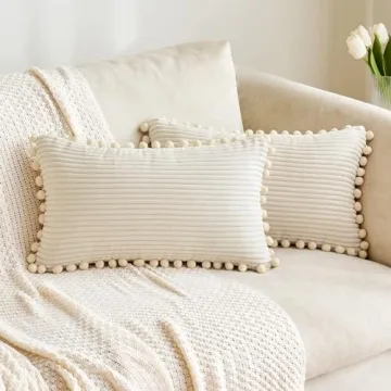 Show more Introducing the MIULEE Christmas Boho Decorative Spring Throw Pillow Covers, the ultimate accessory to elevate your home decor while adding a touch of festive charm! Each pillow cover features adorable pom-poms on either side, offering a delightful combination of cuteness and elegance. Crafted from soft corduroy fabric, these covers provide a cozy touch to your living space, making them ideal for snuggling up during chilly winter nights. The hidden zipper design ensures an effortlessly smooth closure that maintains the plush aesthetics of your pillows. Available in a classic creamy hue with a timeless striped pattern, these pillow covers seamlessly blend with various decor styles, decorating your sofa, couch, or bed with ease.