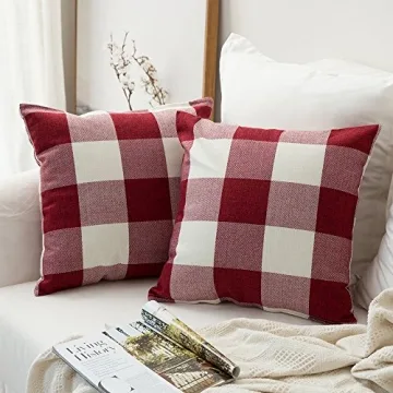 MIULEE Pack of 2 Christmas Classic Farmhouse Buffalo Check Plaids Linen Soft Soild Decorative Square Throw Pillow Covers Home Decor Cushion Case for Sofa Bedroom 18x18 Inch, White and Red