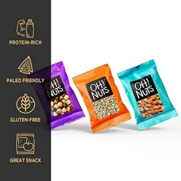 Show more Discover a delightful world of snacking with our Mix Roasted Salted Individual Nut Snacks by Oh! Nuts. Designed for the health-conscious yet flavor-loving individual, this assortment of 12 convenient packets offers the perfect portion of crunchy, roasted nuts that are not just a treat for your taste buds but also a smart addition to your diet. Each packet contains a curated mix of premium cashews, almonds, and pistachios, expertly roasted to unlock their rich, natural flavors. These nuts are carefully seasoned to provide a slight crunch and a hint of saltiness that perfectly satisfies your snacking cravings. Whether you’re at home, in the office, or enjoying a day out, these snacks are meant to accompany your busy lifestyle while keeping your energy levels up, with a healthy dose of protein in every bite.