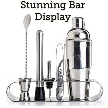 Show moreTransform your home into a high-class bar with our professional bartender set, designed for those who aspire to be masters of mixology. This all-in-one cocktail kit is crafted from heavy-duty stainless steel alloy, ensuring durability and resistance to rust. The set includes a 24oz shaker, a Mojito muddler, double jigger, ice tongs, mixing spoon, two liquor pourers, a bottle opener, and a corkscrew, making it the perfect companion for any aspiring mixologist.