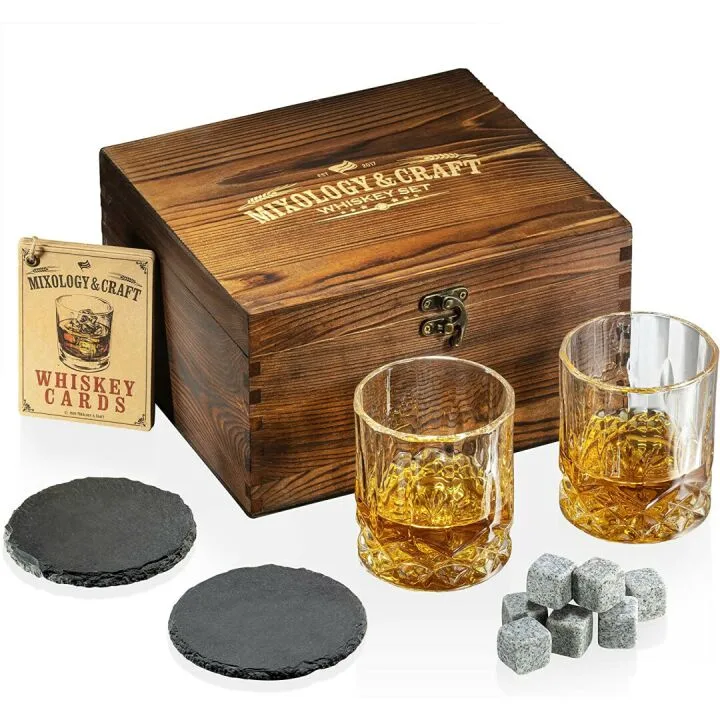 The set includes 2 Old Fashioned 10 oz glasses, 8 granite whiskey stones in a velvet storage bag, 2 slate coasters, and whiskey recipe cards, all housed in a chic rustic wooden crate.