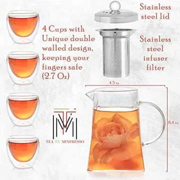 Show more Experience the sophistication of tea making with this High-Quality Tea Pot Set, a luxurious addition to any tea lover's collection. Made from double-walled borosilicate glass, this exquisite tea kettle not only boasts durability but also elegance, allowing you to savor the delicate hues of your tea. Among its standout features is a maximum capacity of 33oz, perfect for brewing flavorful herbal blends or loose leaf teas, serving 8-10 cups effortlessly. Designed thoughtfully for both aesthetics and functionality, it comes equipped with a detachable lid and a stainless steel infuser mesh that ensures thorough steeping.