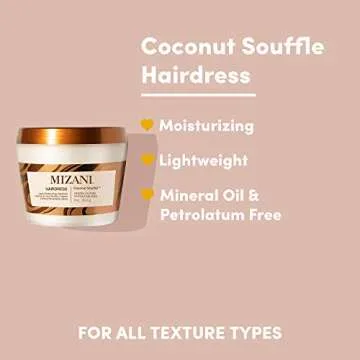 Show moreIntroducing the Mizani Coconut Soufflé, an exquisite 8-ounce hairdress meticulously designed for those who cherish the health and beauty of their hair. Crafted by the esteemed brand Mizani, this lightweight and non-greasy formula is intended specifically for normal hair types and works wonders to revitalize your curls with a delightful touch. Infused with the nourishing properties of coconut and camellina oils, this whipped hairdress provides deep hydration that penetrates the hair shaft, helping restore moisture balance while delivering vital nutrients.
