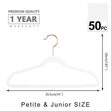 Show more Introducing the MIZGI Premium Kids Velvet Hangers, a stylish and functional addition to your children's closet. This pack of 50 deluxe hangers is designed to meet the needs of your growing kids, offering a perfect blend of elegance and practicality. The 14-inch width, coupled with a unique copper rose gold hook, not only makes them visually appealing but also extremely functional. Whether you have toddlers or young teenagers, these hangers provide the ideal solution for organizing clothing without sacrificing style.