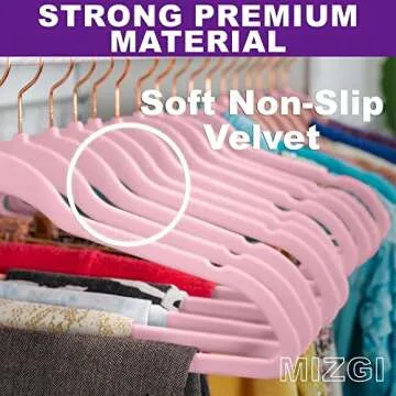 Show more Introducing the MIZGI Premium Velvet Hangers, the ultimate solution for all your closet organization needs! This pack of 50 hangers combines practicality with style, offering a chic light pink color accented with rose gold hooks. Crafted from high-quality 2024 ABS plastic, these hangers are eco-friendly and designed to withstand the test of time. With dimensions of 17.5"x0.2"x9" inches, they're perfect for any adult standard-sized wardrobe. The innovative velvet flocked surface not only adds a touch of elegance but also ensures that your clothes will cling securely to the hangers without slipping off or losing their shape. Say goodbye to creases and hello to a beautifully organized closet that showcases your wardrobe in the best possible light!