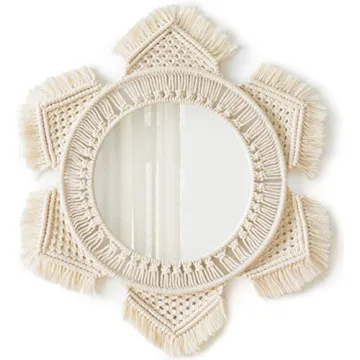 Show more The perfect blend of functionality and art, the Macrame Wall Hanging Mirror is designed to transform any space with its stunning aesthetic. This exquisite piece features a diameter of about 9 inches for the mirror itself and extends to 20 inches when you consider the intricate petal fringe. Each detail of this mirror speaks to the bohemian folk style, making it an ornate addition to your home decor. Crafted from high-quality cotton rope and durable glass, this mirror is designed not only for beauty but also for utility.