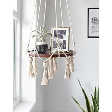 Mkono Hanging Shelf Macrame Plant Hanger Flower Pot Holder Boho Home Decor (with Wood Plate)