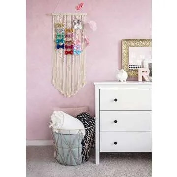 Show moreIntroducing the charming Mkono Macrame Bow Holder, the ultimate accessory for every little girl's hair collection! This delightful organizer is expertly crafted to elegantly store your child's hair bows, headbands, and clips, ensuring that every colorful piece has its special place. Made by the reputable brand Mkono, known for its quality home décor items, this stylish bow holder combines functionality with a beautiful aesthetic, making it the perfect addition to any nursery or child's room.
