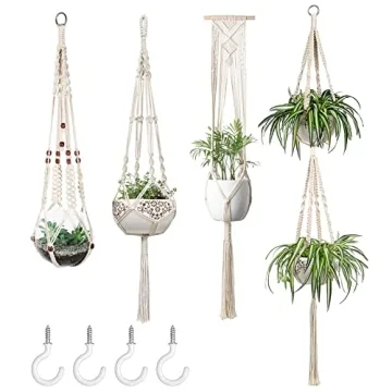 Show moreTransform your home into a botanical paradise with the Mkono Macrame Plant Hangers Set. This exquisite collection features four unique plant hangers that seamlessly blend modern aesthetics with vintage charm. Whether you're styling a cozy corner in your living room or beautifying your balcony garden, these hangers provide a perfect touch of bohemian flair. Each piece is designed with versatility in mind, effortlessly accommodating pots of various shapes and sizes (note: pots are not included). Elevate your indoor and outdoor decor game with these stunning hangers crafted from soft yet durable cotton cord that promise both elegance and functionality.