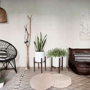 Show more Transform your living space with the exceptional Mkono Modern Design Plant Stand. This elegant house floor planter stand embodies a minimalist aesthetic, drawing inspiration from classic mid-century style. Its refined square legs seamlessly integrate with various home décors, making a perfect complement to a wide array of plants, including the trendy fiddle leaf fig, cactus, snake plants, and more. The stand elevates your favorite greenery, allowing it to shine while also optimizing corner spaces, creating an eye-catching feature in any room.