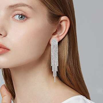 Show more Introducing the exquisite Mlouye Clip on Earrings Long Crystal Tassel Fringe, perfect for brides, bridesmaids, or anyone who wants to elevate their style with a touch of elegance. These stunning earrings, measuring 3.3 inches in length and 0.6 inches in width, are intricately designed with eco-friendly base metal and adorned with dazzling Austrian crystals, ensuring an eye-catching sparkle that will make you the center of attention at any event. Weighing only 6g each (totaling 12g), these lightweight earrings provide maximum comfort while delivering brilliant style. Perfectly polished with a beautiful finish, these earrings reflect light beautifully, making them a must-have accessory for your jewelry collection.