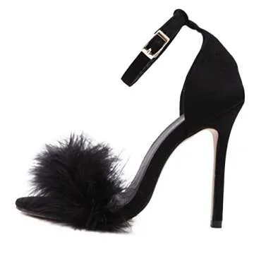 MMJULY Women's Open Toe Ankle Strap Fluffy Feather Stiletto High Heel Dress Sandal in Black - US 7.5