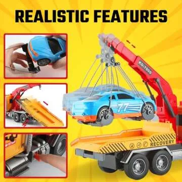 Show moreIntroducing the MOBIUS Toys Tow Truck Flatbed and Crane with Race Car Playset, a thrilling and innovative toy designed to bring endless fun to children aged 3-8. This impressive 15" rescue vehicle sets the stage for epic towing adventures, equipped with exciting mechanical features that will spark kids' imaginations. With an air action button that allows the crane boom to lift and rotate up to 60 degrees, young adventurers can effortlessly scoop up the race car and transport it securely onto the flatbed. This toy is not only about play but also brings a realistic experience, making it an ideal gift!