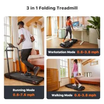Show more The Mobvoi Home Treadmill Plus is a game-changer for fitness enthusiasts who value convenience and versatility in their workouts. This 3-in-1 folding under-desk treadmill operates in three distinct modes: a running mode with speeds up to 7.6 mph, a walking mode with a comfortable maximum of 3.8 mph, and a workstation mode, allowing you to multitask while staying active. Its sleek, foldable design makes it effortlessly portable, allowing you to store it under your desk, sofa, or bed with ease. With included built-in wheels, moving the treadmill around the house is a breeze.