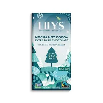 Show more Indulge in the rich, decadent taste of our keto-friendly Mocha Hot Cocoa Dark Chocolate Bar from Lily's Chocolate, crafted especially for chocolate enthusiasts who appreciate the finer flavors in life. Made with 70% cocoa for those with a taste for intense chocolate, this bar embraces the delightful notes of mocha with a hint of coffee, creating a gourmet experience that is both satisfying and low carb.