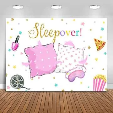 Show more Elevate your next party or event with this stunning sleepover backdrop that measures a generous 5 x 3 ft (150 cm width x 100 cm height). Designed to captivate, this backdrop is not only visually striking but also practical. Made from high-quality cotton fabric, it resists creasing, making it a superior choice compared to vinyl options. The softness of the fabric ensures that it drapes beautifully, providing an elegant touch to your setting while being durable and reusable for future events.