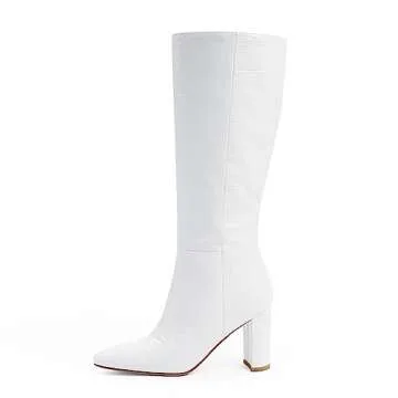 Modatope Women's White Faux Crocodile Knee-High Boots, Size 9, Block Heel, Pointed Toe, Zipper