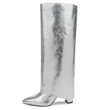 Modatope Womens Silver Boots Silver Fold Over Knee High Boots Chunky Heel Pointed Toe Boots Dress Tall Block Boots Silver Long Boots Size 10