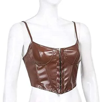 Modegal Women's Vintage Faux PU Leather Hook Front Slim Fit Bustier Open Back Cami Corset Top (PU Brown, S)