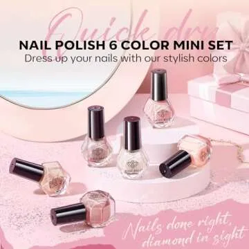 Show more Discover the ultimate nail polish set designed for both convenience and creativity! This unique collection features six stunning colors, each formulated without the need for UV curing. Imagine a world where you can achieve beautiful, salon-quality nails in just 1-2 minutes. With our innovative formula that dries 30% faster than other brands, you can complete a full two-layer application on your hands in approximately 15 minutes. Experience the efficiency of quick and effective drying, allowing you to focus on showcasing your stylish nails rather than waiting for them to dry!