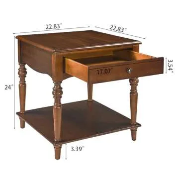 Introducing the **MODERION End Table with Drawer and Open Storage Shelf**—a timeless piece that combines classic design with modern functionality. Crafted from high-quality solid wood, this charming side table boasts an elegant caramel brown finish that seamlessly blends with any decor. With beautifully turned legs and a sophisticated drawer pull, it not only serves as an attractive furniture piece but also enhances the overall ambiance of your room. Measuring 22.83” L x 22.83” W x 24” H, this table...