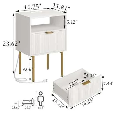 Modern Nightstand with Charging Station and LED Lights, White Bedside Table with Drawer, Fluted Side Table for Living Room, Bedroom