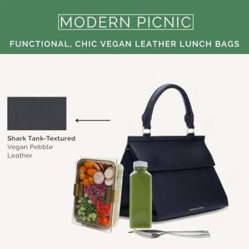Modern Picnic Vegan Leather Lunch Bag for Women, Cooler Lunch Bag for Girls, Easily Wipeable, Adjustable Shoulder Strap, Womenโs Lunch Bags for Work/Office/Outdoor, (Black) As Seen on Shark Tank