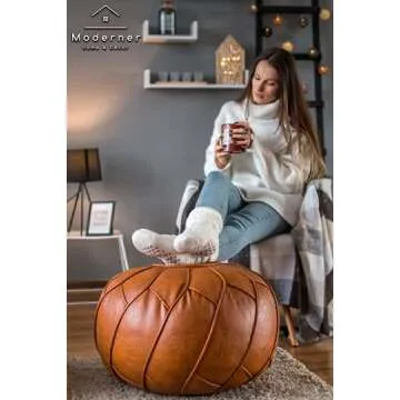 Show moreThe MODERN POUF OTTOMAN is a stunning piece of furniture that brings together style, functionality, and practicality in one exquisite design. This Moroccan-inspired pouf embodies a new mid-century vibe, offering a touch of elegance while seamlessly fitting into various home aesthetics. Crafted with a rich, warm light brown leather color, this pouf is not just visually appealing; it also serves as an impressive storage solution for anyone looking to maximize their space.