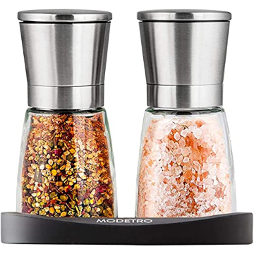 Show more Elevate your culinary adventures with the **Modetro Salt and Pepper Grinder Set**! This elegantly designed duo combines aesthetic appeal with unparalleled functionality, making it an essential tool for every kitchen. Crafted with care, these grinders feature a robust ceramic grinder that allows you to effortlessly switch from exquisitely coarse to finely milled spices, tailored to your teaching and taste buds. Each grinder stands perfectly at just under 5.5 inches tall, offering a **contemporary stainless steel exterior** that beautifully complements any kitchen decor while ensuring functionality.