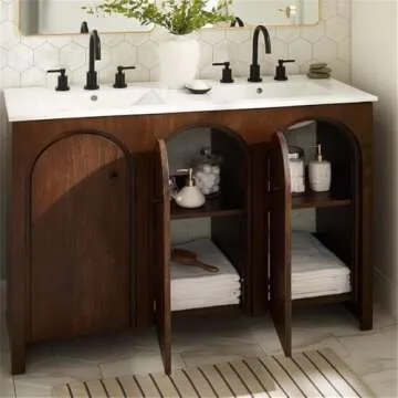 Show moreThe Modway Appia 48" Bathroom Vanity is the epitome of retro elegance and modern functionality for your bathroom space. Crafted with meticulous attention to detail, this vanity features unique arched doors and a mango wood veneer finish that beautifully marries vintage charm with organic aesthetics. It's not just a piece of furniture; it’s a statement that elevates your bathroom's ambiance while providing a practical storage solution. With its remarkable dimensions of 47"W x 18"D x 33.5"H, this vanity is spacious enough to house all your bathroom essentials while supporting up to 250 lbs on its robust top panel.