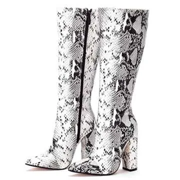 MOFEEDOUKA Women's Boots Knee High Snake Print Bootie Chunky High Heels Pointed Toe Women Shoes